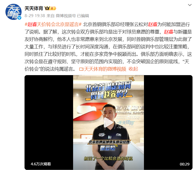 北京媒体也对“赵睿天价转会费”的传闻进行了辟谣,北京队GM张云松接受采访时表示从新疆队手里得到赵睿,是在遵守规则&坚守原则的范围内实现的。