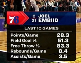 开云体育官网-过去10场比赛:恩比德场均28.3分8.4板3.5助 投篮51.3%&罚球83.3%