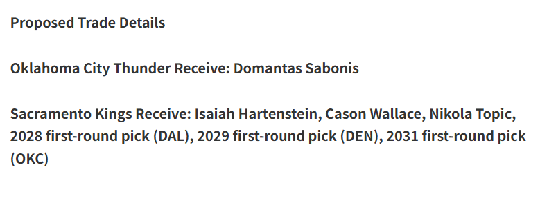 具体方案如下:雷霆得到:小萨博尼斯,国王得到:哈滕+华莱士+托皮奇+28年来自独行侠首轮签+29年来自掘金首轮签+31年雷霆首轮签(雷霆最不缺首轮)。首先,对国王来说,和小萨博尼斯分手只是时间问题。国王当初在哈里伯顿和福克斯之间选择后者,上赛季哈里伯顿已经带队打到总决赛,而国王最终用福克斯换来了拉文!休赛期国王一直在追求库明加,引发的后果是蒙克随时准备离开,德罗赞也可能成为牺牲品,算上拉文的累赘合同,国王很难进西部前十。小萨博尼斯从上赛季就不满球队缺乏竞争力,和球队关系一般。