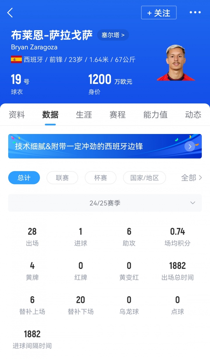 自2023-24赛季首次亮相以来,萨拉戈萨在西甲总计出场3488分钟,平均每90分钟完成2.84次成功过人。这在所有球员中排名第六,仅次于亚马尔、阿克马赫、尼科·威廉姆斯、维尼修斯和萨维尼奥。他的能力足以让防守失衡,堪称顶尖。